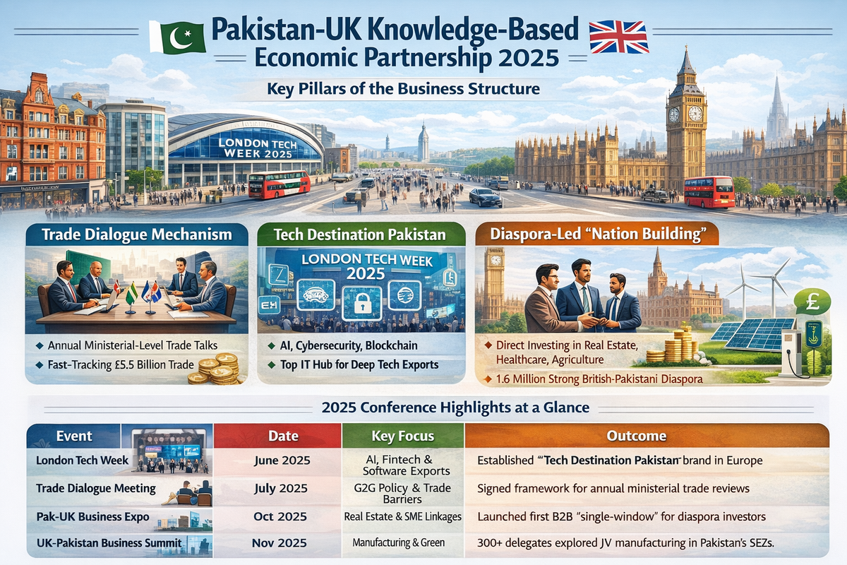 EventDateKey FocusOutcomeLondon Tech WeekJune 2025AI, Fintech, & Software ExportsEstablished "Tech Destination Pakistan" brand in Europe.Trade Dialogue MeetingJuly 2025G2G Policy & Trade BarriersSigned framework for annual ministerial trade reviews.Pak-UK Business ExpoOct 2025Real Estate & SME LinkagesLaunched first B2B "single-window" for diaspora investors.UK-Pakistan Business SummitNov 2025Manufacturing & Green Energy300+ delegates explored JV manufacturing in Pakistan's SEZs.